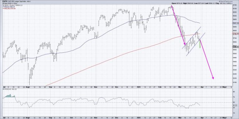 I always think of charts in terms of key price levels, what I call “lines in the sand,” so I can set alerts and focus on taking action only when the chart confirms a new trend. In this case, the 5500 level seems to be the most important price point to monitor, as a violation of that support level would mean a breakdown through Fibonacci support as well as the March swing low.