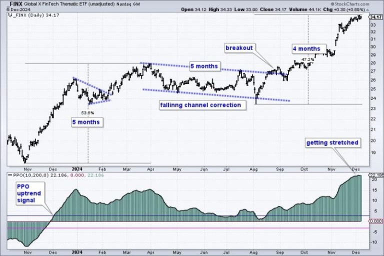 FINX is both strong and extended. The chart shows FINX advancing 53.6% from November to March. It then moved into a long corrective period as the falling channel formed over the next five months. This correction ended with a breakout in late August and the ETF recorded its first new high in mid September. FINX extended further and led the market over the last four months.
