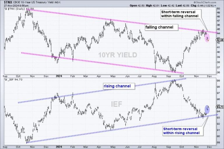 The first chart shows the 10-yr Treasury Yield ($TNX) in the top window and the 7-10 Yr Treasury Bond ETF (IEF). $TNX is the yield multiplied by 10. I used this version because it is updated in real-time, as opposed to end of day. $TNX and IEF are mirror images. The 10yr Yield is within a large falling channel and the 7-10Yr T-Bond ETF is within a large rising channel. The yield falls when the bond price rises.