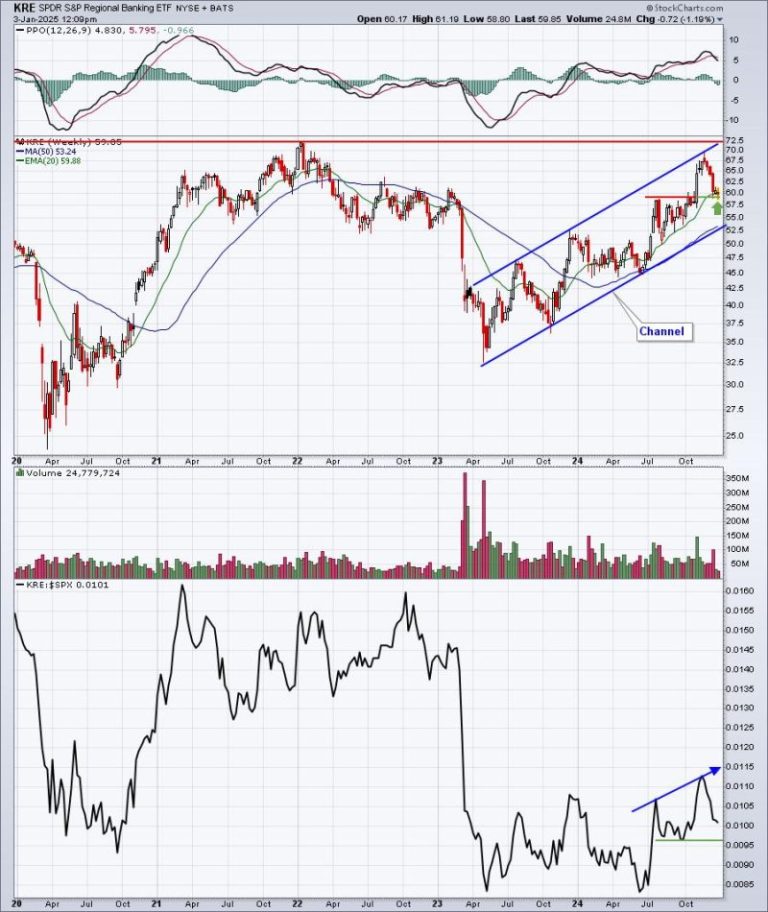 This is an interesting chart. The channel lines don’t connect perfectly, especially the lower uptrend line, but it’s close. Furthermore, the KRE printed a double bottom at 59, almost squarely on gap support that was created by the 2024 Presidential Election results. In order to feel more bullish about this chart, I’d like to see the KRE move higher and clear both the declining 20-day EMA and recent price resistance at about 61.50. For a final look at the KRE, check this out.