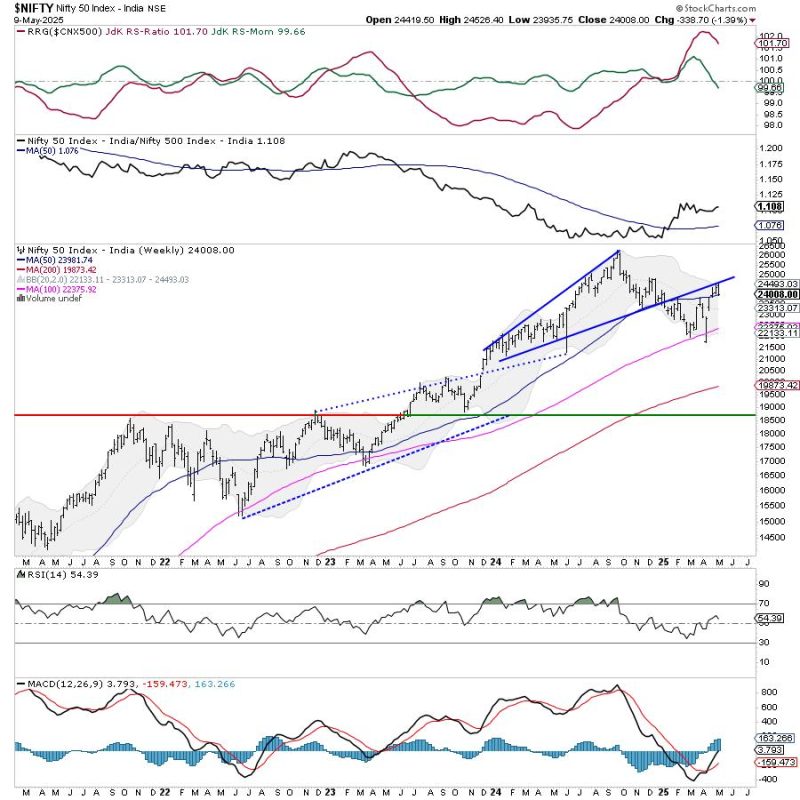 Amid ever-increasing uncertainties on the global front and similarly rising geopolitical tensions between India and Pakistan, the Indian equity markets demonstrated strong resilience. They consolidated before ending the week on just a modestly negative note. The trading range remained modest; the Nifty oscillated in a 590-point range. While the markets defended their key support levels, the volatility surged. The volatility barometer, the India Vix, spiked 18.49% to 21.63 on a weekly basis.. The headline index finally closed with a net weekly loss of 338.70 points (-1.39%).